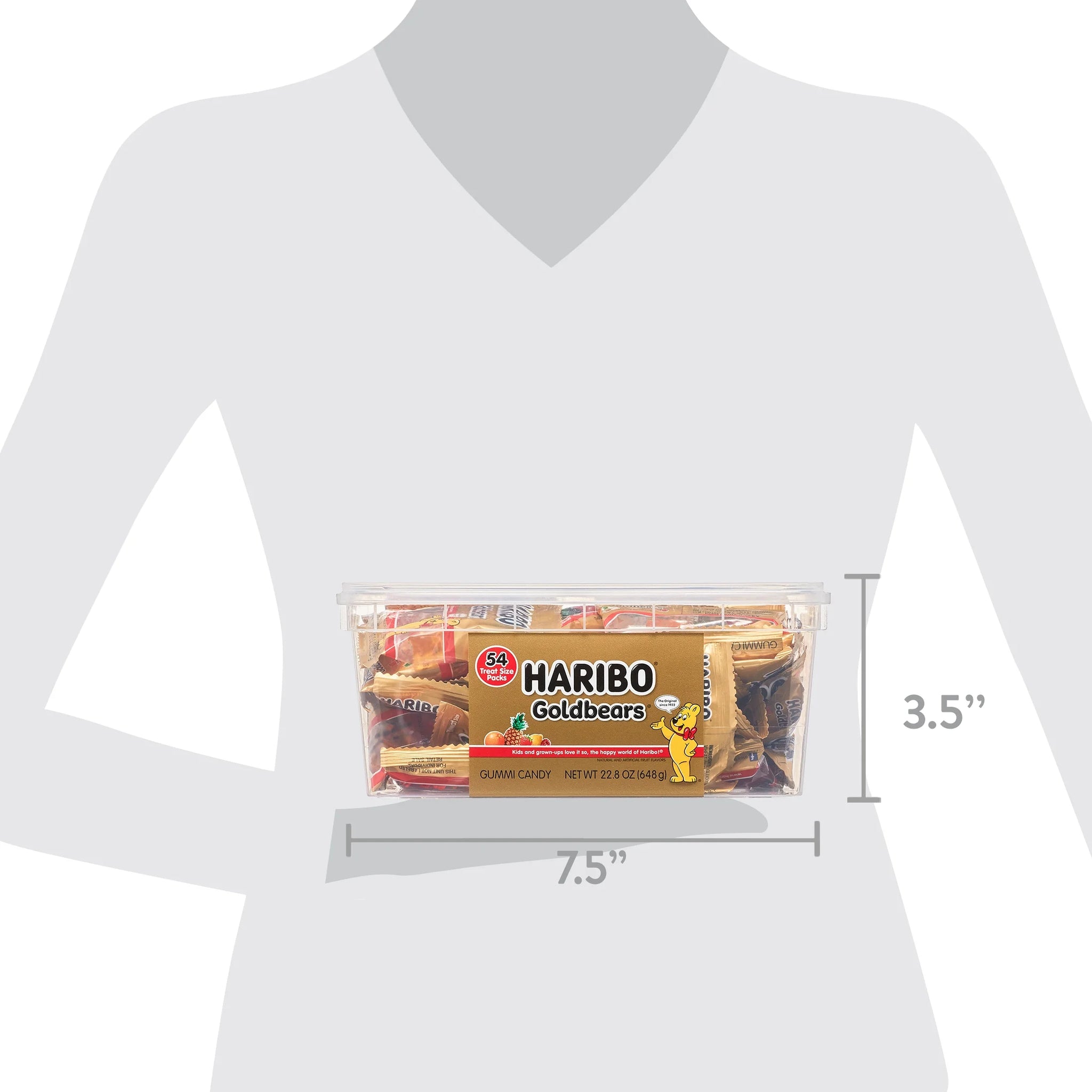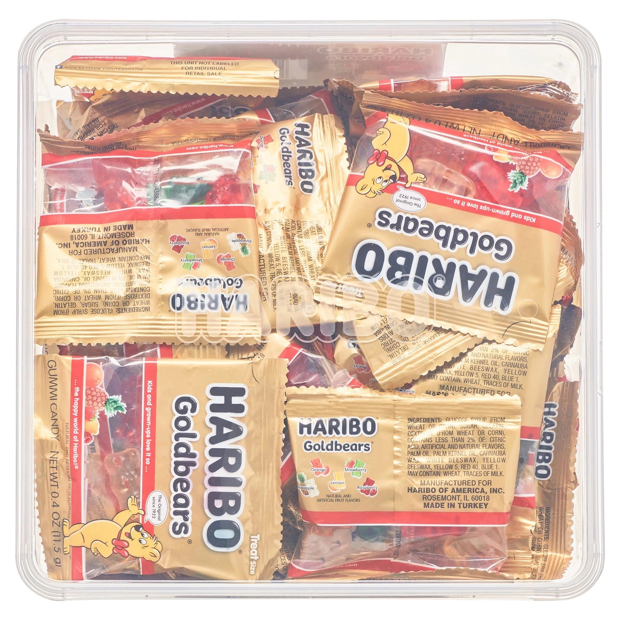 Haribo GOLD BEARS Gummi Candy in 5 classic and delicious flavors including Lemon, Orange, Pineapple, Raspberry, and Strawberry all in a 54 count Tub. Enjoy this Haribo GOLD BEARS Gummi Candy filled tub bursting with fruity flavor! Contains five flavors: lemon (yellow), orange (orange), pineapple (white), raspberry (red) and strawberry (green). Bursting with fruity flavor, and that lovable chewy gummy bear shape! Kids and grown-ups love it so, the happy world of HARIBO